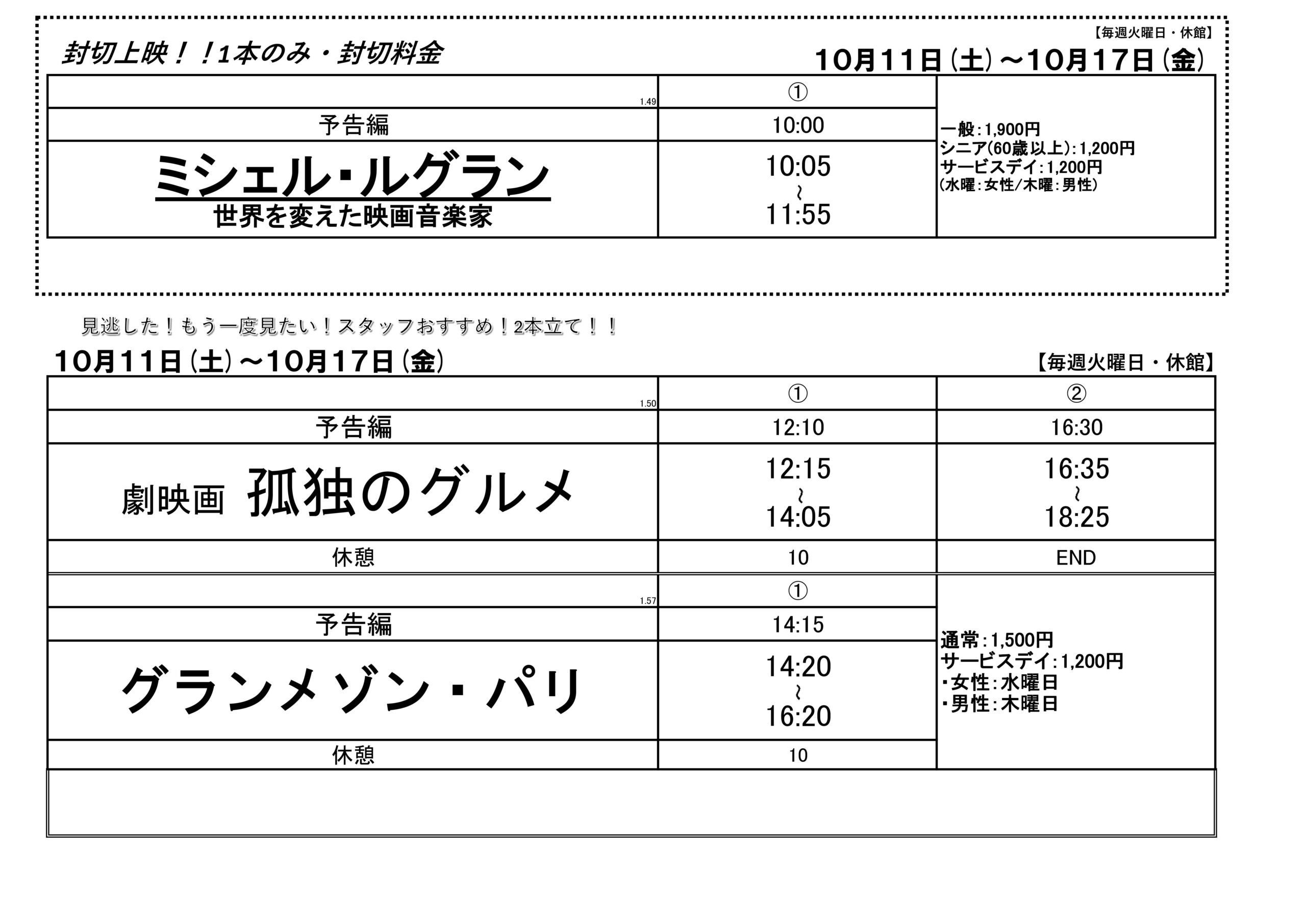 時間表10/11(土)~10/17(金)