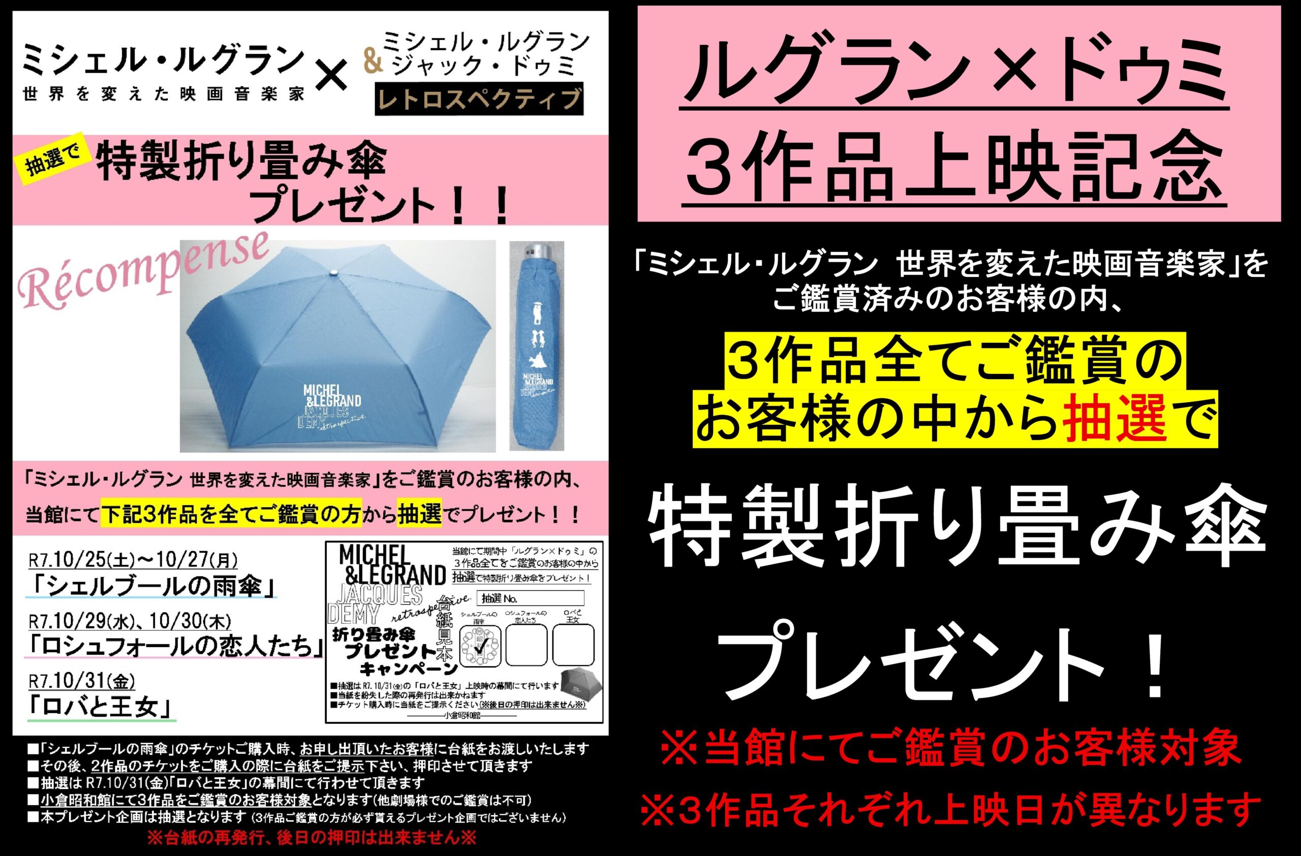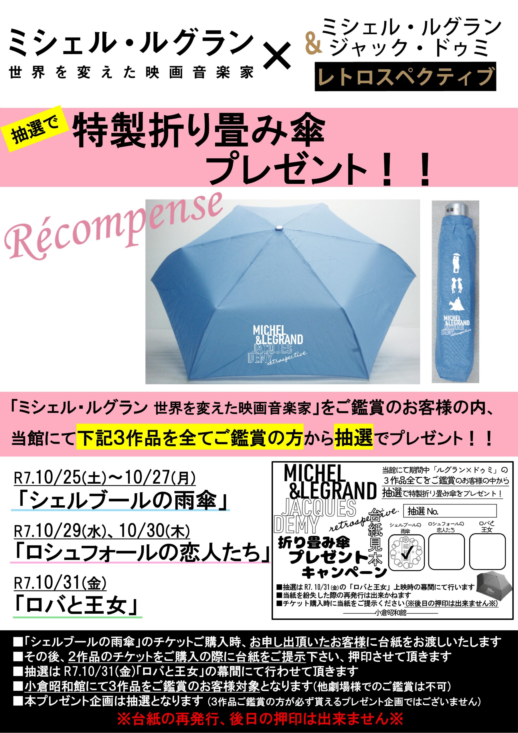 「ミシェル・ルグラン 世界を変えた映画音楽家」をご鑑賞済みのお客様の内、該当する3作品全てをご鑑賞の方の中から抽選で、特製折り畳み傘をプレゼント。