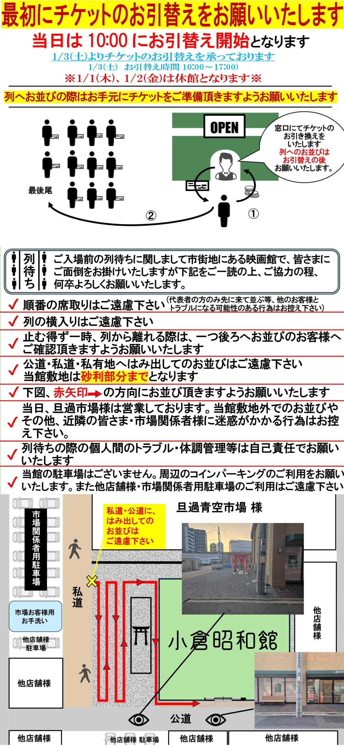 開場前にお待ち頂くお客様はご迷惑をお掛けいたしますが、下図のご一読・ご協力をお願いいたします。