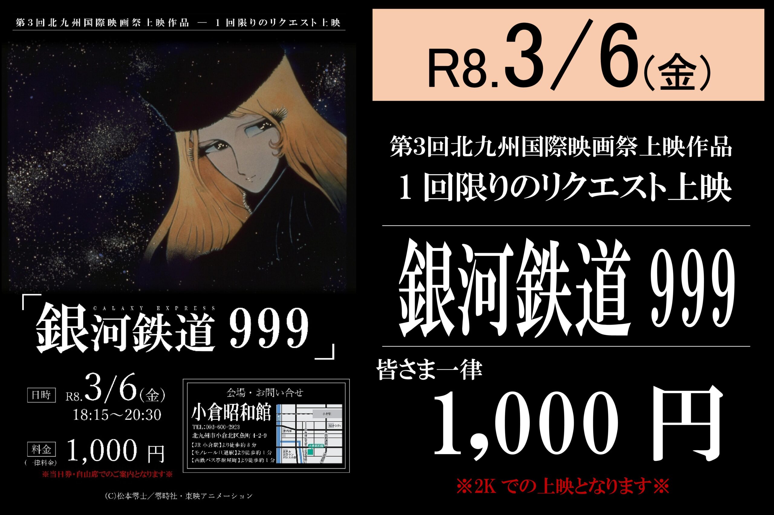 R8.2/27~3/1に開催された第3回北九州国際映画祭の中で当館にて上映した「銀河鉄道999」ですが、一回限りのリクエスト上映が緊急決定!!